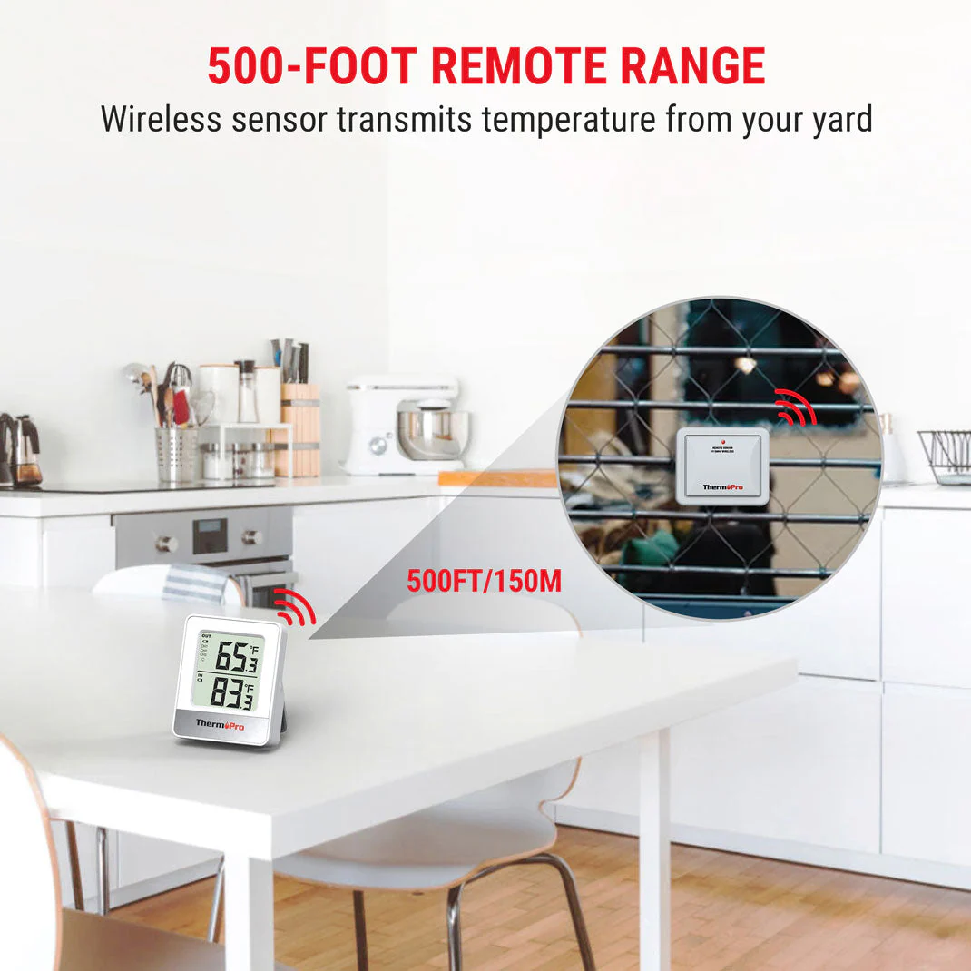 500-ft Wireless Range for Effortless Monitoring: With its advanced RF technology, this wireless indoor outdoor thermometer ensures a reliable connection up to 500′ (without obstructions). Keep an eye on indoor and outdoor temperatures whether you’re in the house, garden, or greenhouse—no need to step outside!